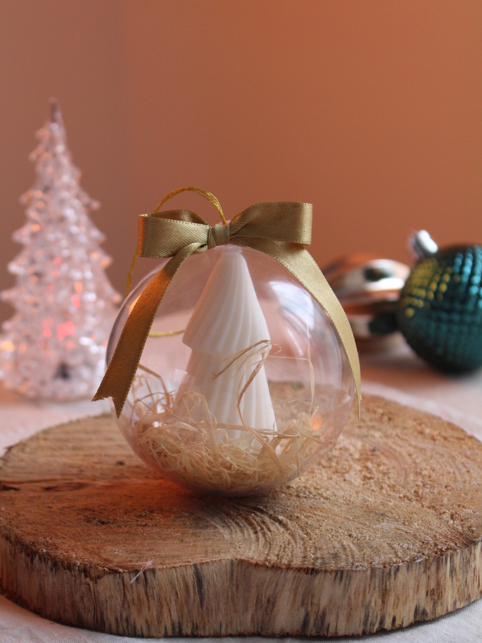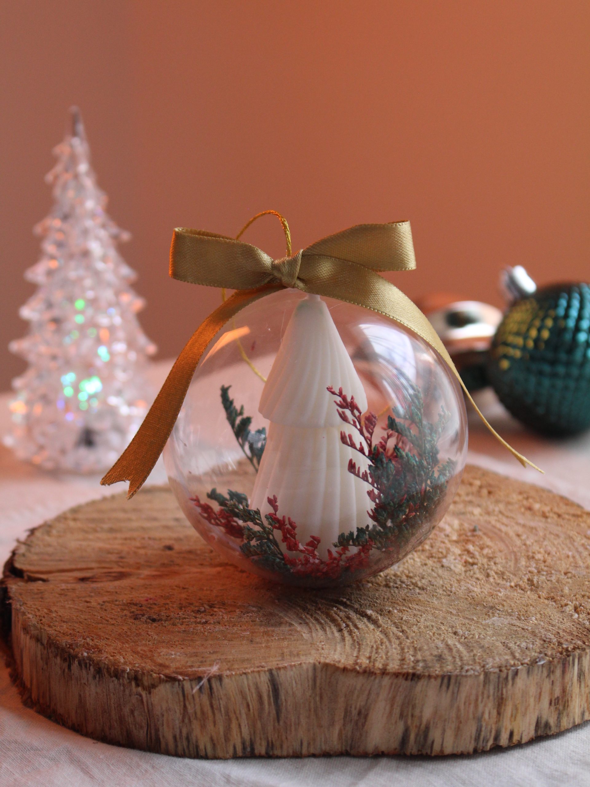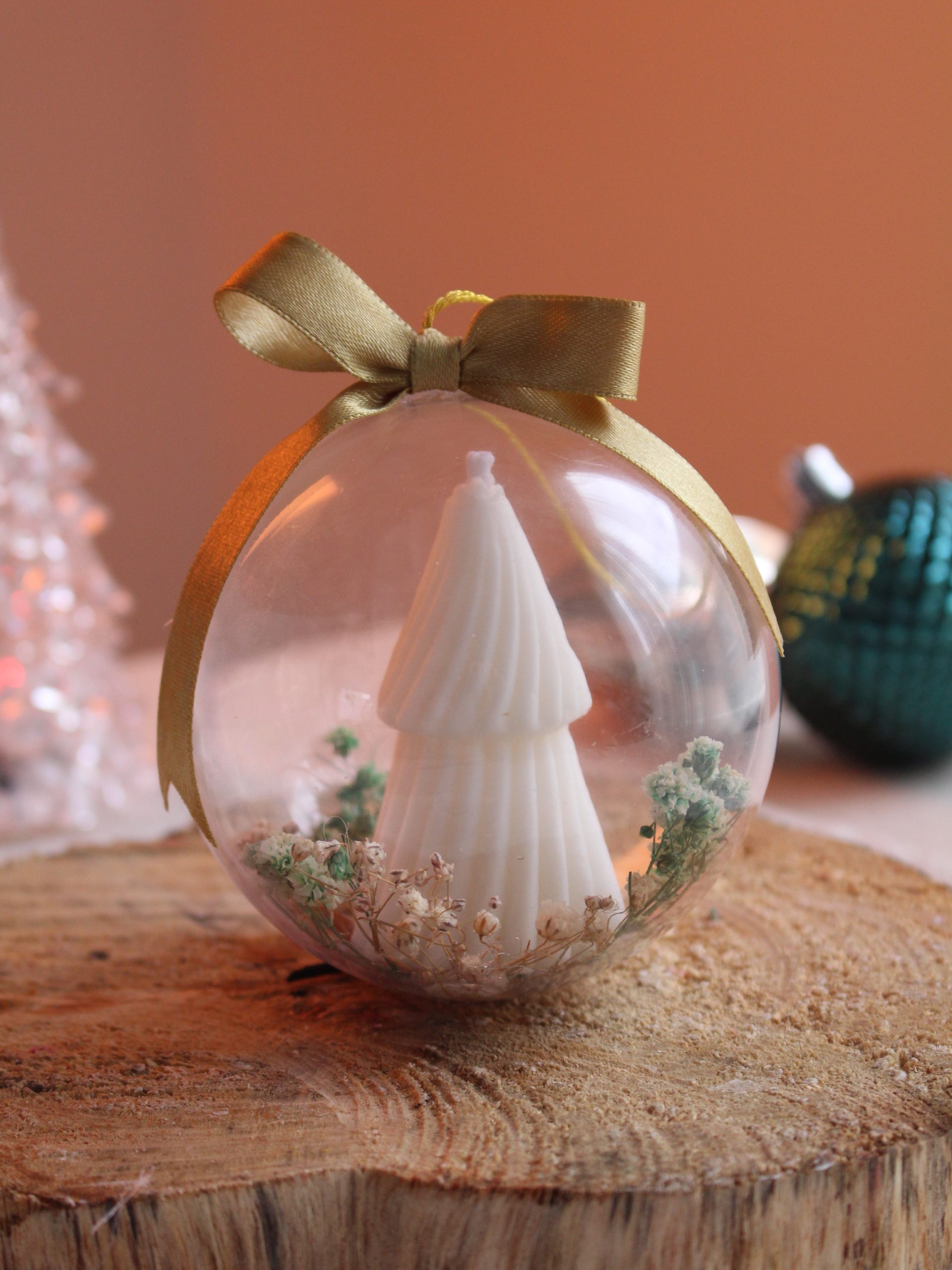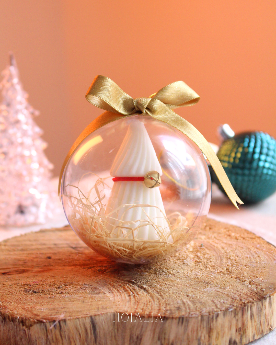 Dale un toque único y cálido a tu árbol con nuestros adornos navideños hechos completamente en vela artesanal, disponible en caja por 5 unidades